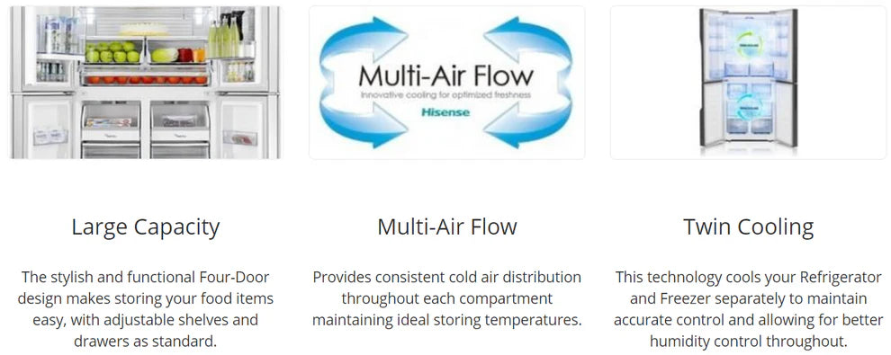 Upgrade Your Kitchen The Hisense 695L French door fridge brings a touch of luxury to your kitchen with its sleek black glass finish. It offers spacious shelving, along with a six-drawer freezer section, making it ideal for large families. The triple zone cooling system ensures that different sections maintain optimal temperatures for longer-lasting freshness. Take advantage of the factory second pricing to upgrade your kitchen at a fraction of the cost.
